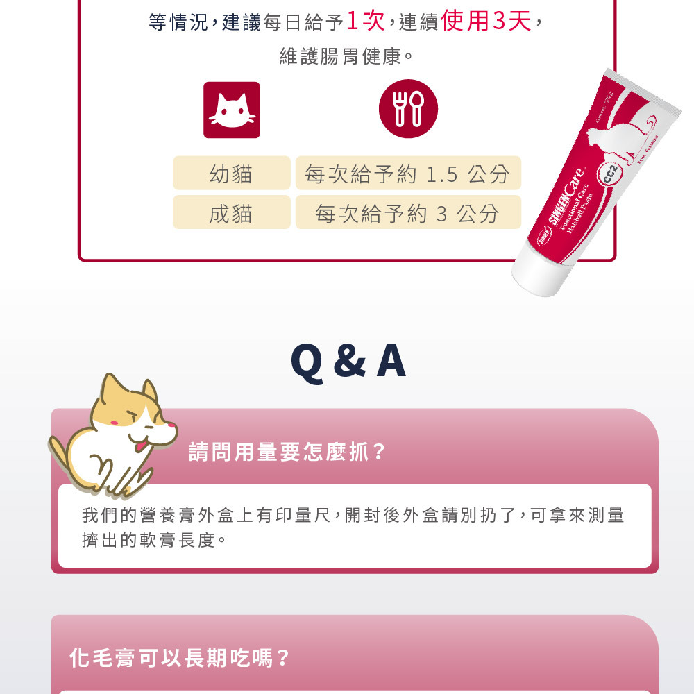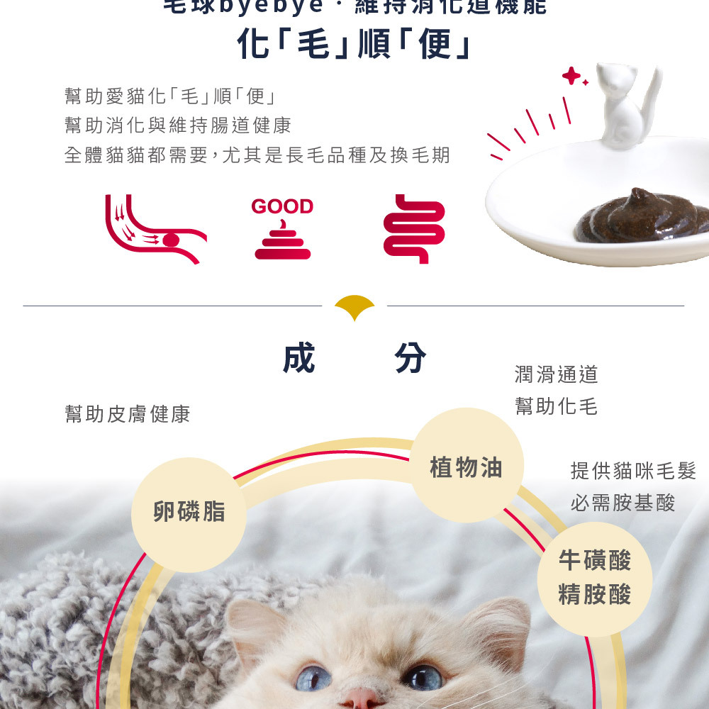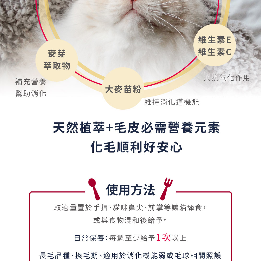 ✔️ 長毛品種、換毛期、適用於消化機能弱或毛球相關照護等情況